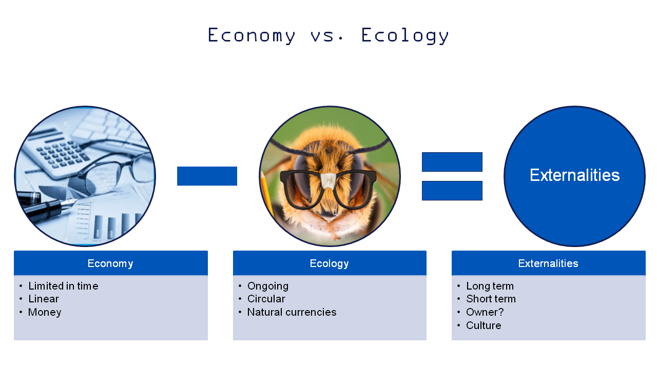 That is what Nature kind of does. Our little accountant bee from the picture could tell us more about that. Nature’s accounting is not based on a snapshot, it is an ongoing process. It is not a photograph, but it is a movie! And a very long one that has no beginning and no end. What can be more circular than that? And to be this circular is must have closed loops all interacting with each other. That is how Nature works. Humans, on the contrary, look at accounting of organizations as independent units from each other. The interactions are not factored in. There is no comprehensive accounting for the entire system, which makes each organization focus only on itself and leaves the others deal with their own. Human accounting limits co-responsibility and collaboration on our long-term impacts.
